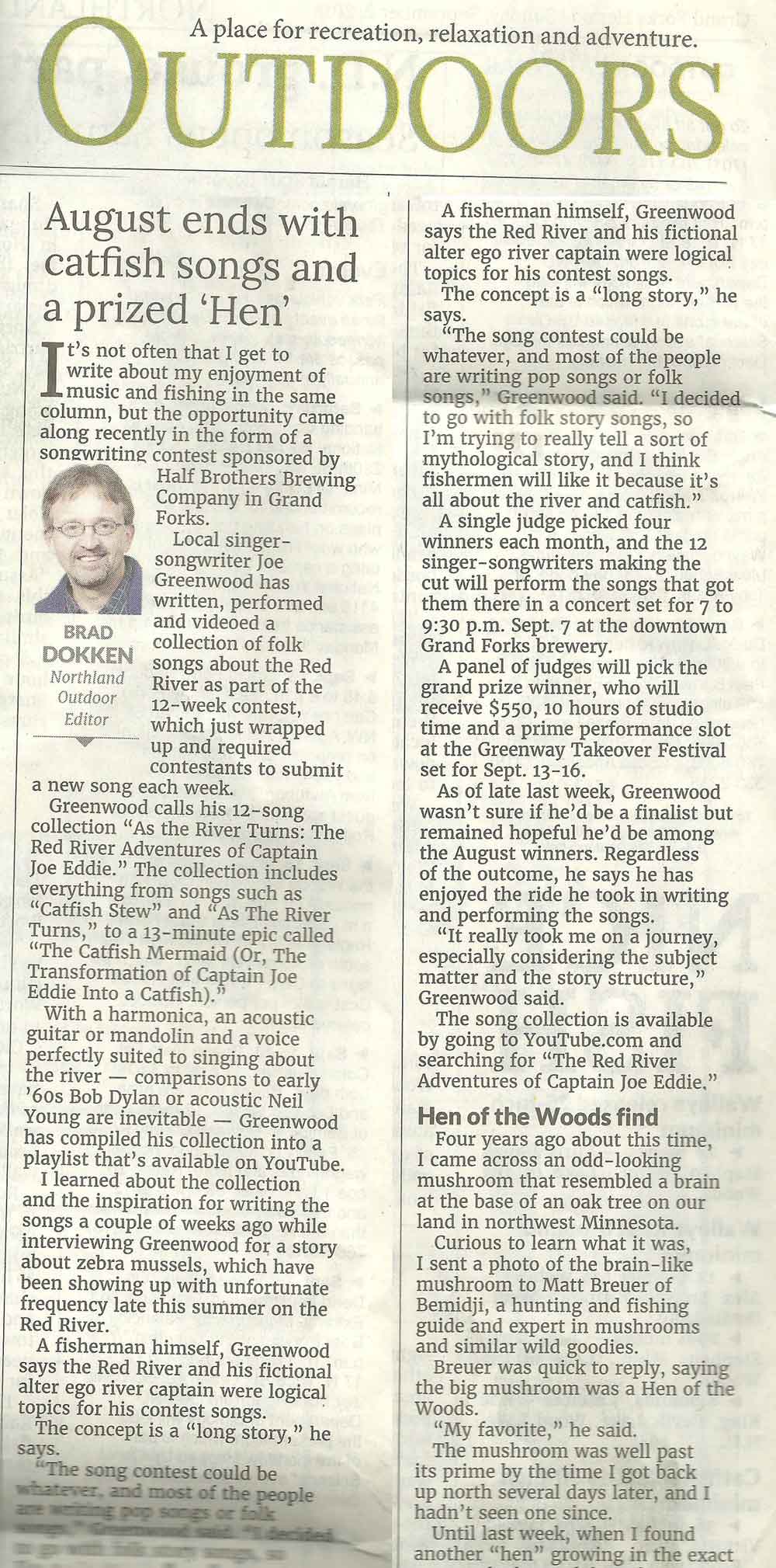 Although I was not named a finalist for the competition, I am happy to have the songs, and the story, and the experience. The song collection was even featured by columnist Brad Dokken in the Grand Forks Herald “Outdoors” section!